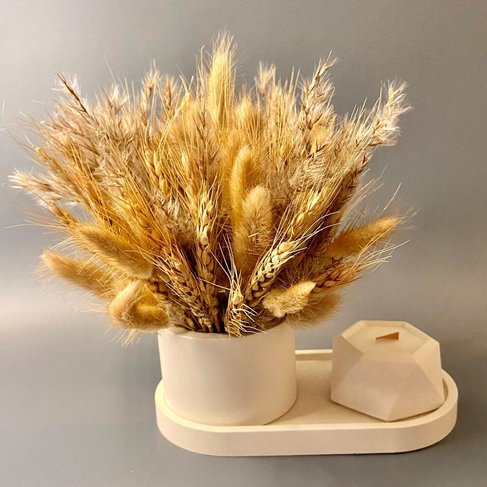 Колоски – 30 шт.Лагурус – 30 шт.Помпасная трава – 10 шт.кашпо гипсовое – 1 шт.поднос гипсовый – 1 шт.свеча ручной работы аромат масло ши – 1 шт.