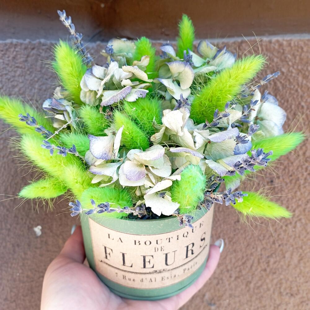 Лаванда (сухоцвет) пучок – 2 шт.Кашпо металлическое – 1 шт.Оазис флористический – 1 шт.лагурус пучок – 3 шт.гортензия стабилизированная – 1 шт.