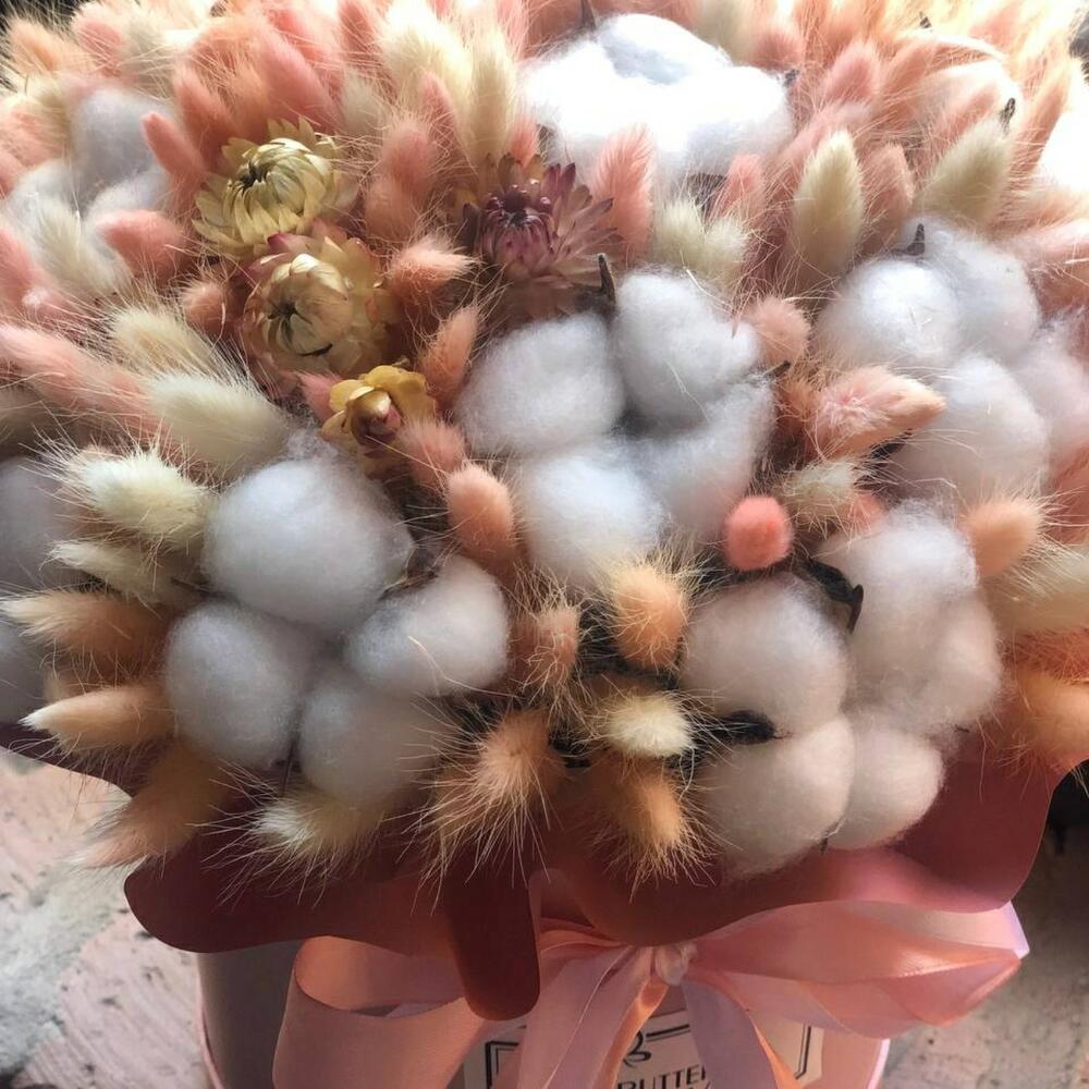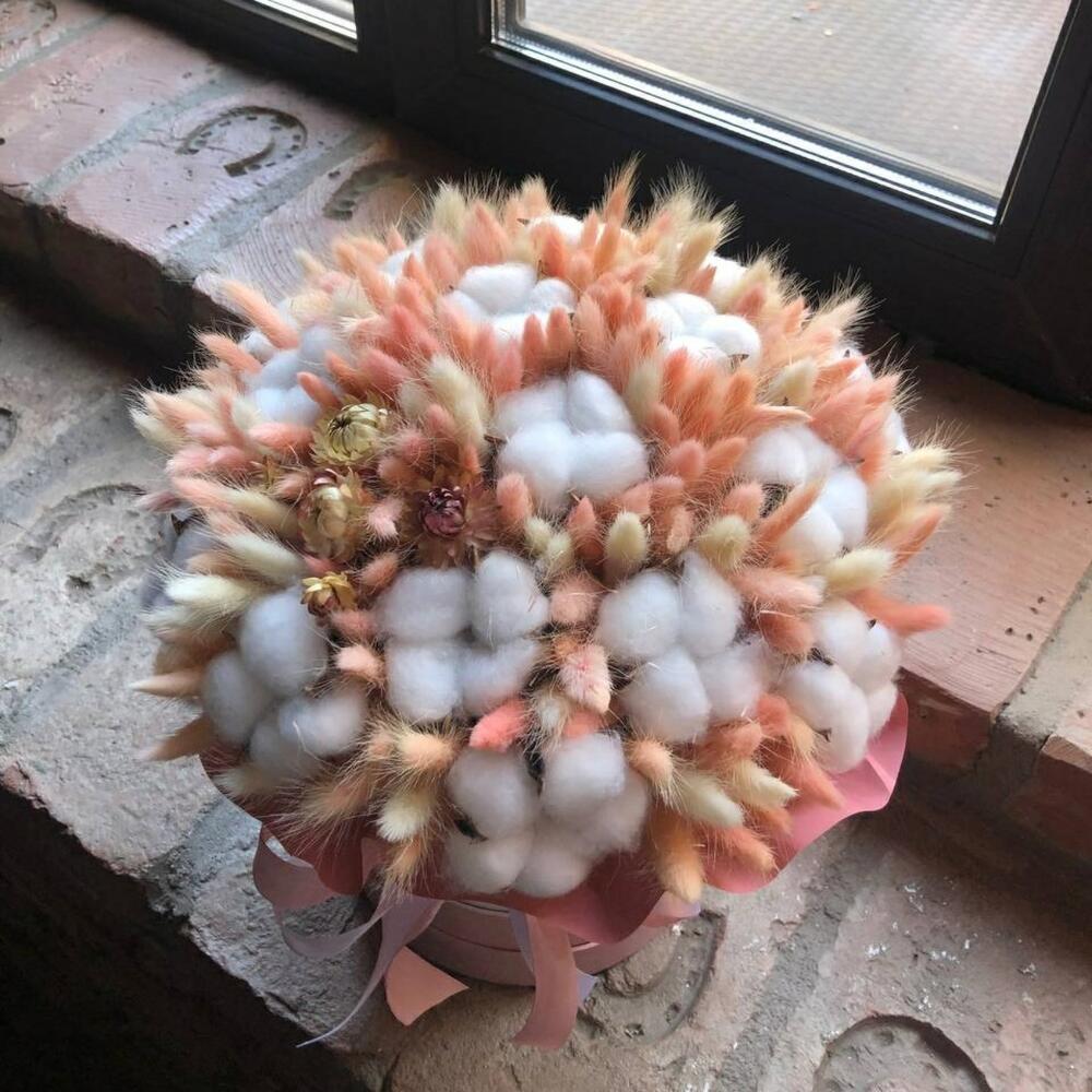 Лагурус – 170 шт.Хлопок – 17 шт.Шляпная коробка – 1 шт.Оазис флористический – 1 шт.Калька упаковка – 1 шт.Лента атласная – 2 шт.Сухоцветы – 3 шт.