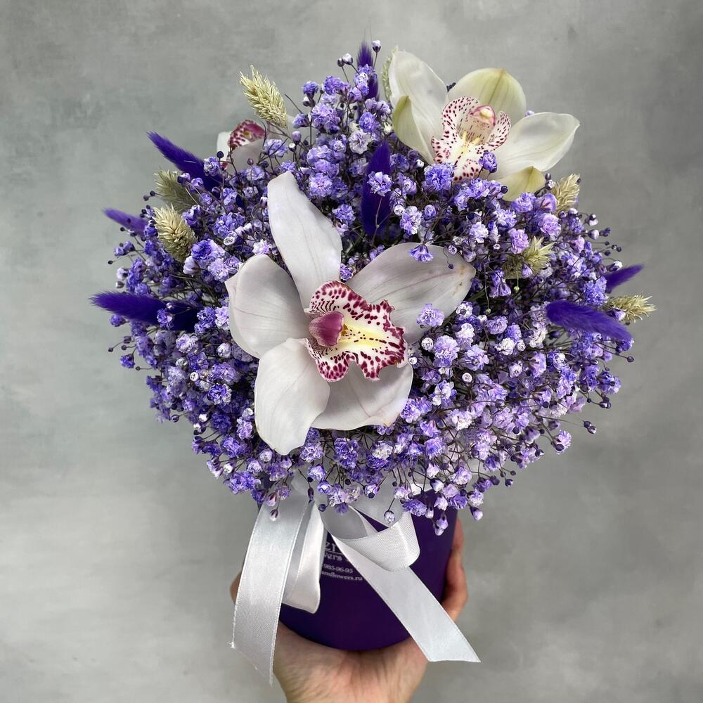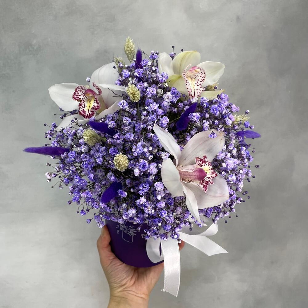 Гипсофила розовая с лавандой в шляпной коробке