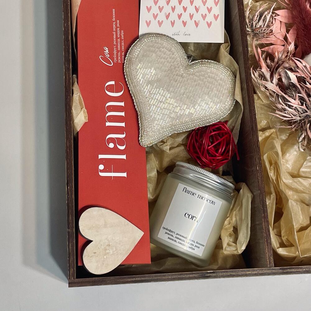 В набор входит:- аромасвеча Cora (грейпфрут, розовый перец, ревень, лаванда, ваниль)- благовония Cora- букет из сухоцветов- шар ротанговый 2шт- сердце деревянное 2шт- сердце мягкое с бисером- открыточка (текст можете написать в комментариях)- деревянный ящик