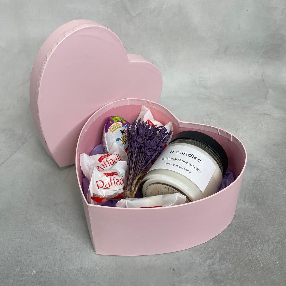 Лаванда (сухоцвет) – 25 шт.Подарочная коробка – 1 шт.Киндер сюрприз – 1 шт.Аромасвеча – 1 шт.конфета раффаэлло – 4 шт.
