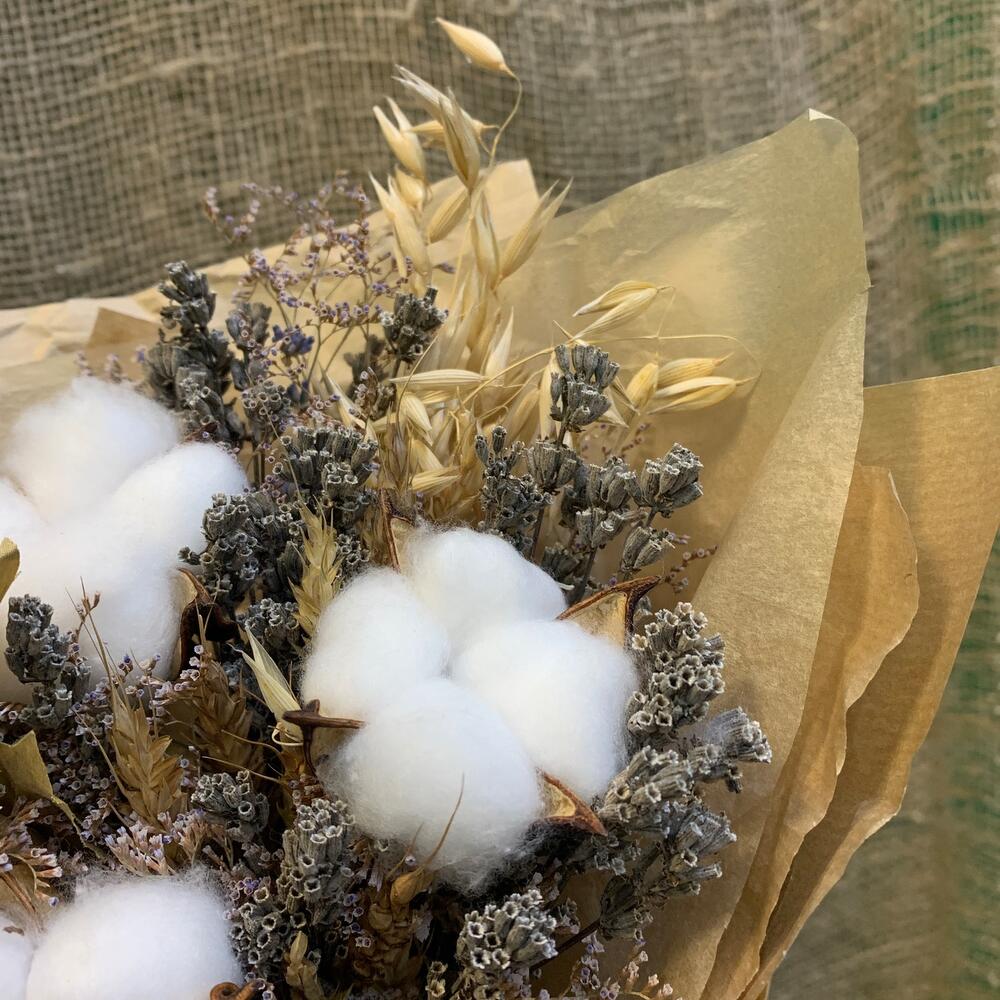 Лимониум – 1 шт.Тишью – 1 шт.Пшеница (сухоцвет) – 17 шт.бечевка натуральная – 1 шт.овес сухоцвет – 7 шт.хлопок белый – 3 шт.лаванда крымская – 1 шт.крафт натуральный – 1 шт.листья искуственные – 2 шт.лаванда садовая – 1 шт.