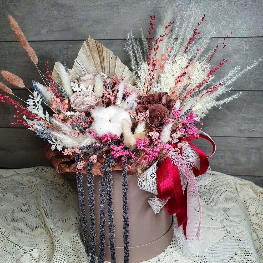 Шикарная композиция в шляпной коробке)))Только натуральный состав)))Разнообразное сочетание стабилизированных цветов и сухоцветов…Станет прекрасным подарком)))Будет радовать не один год