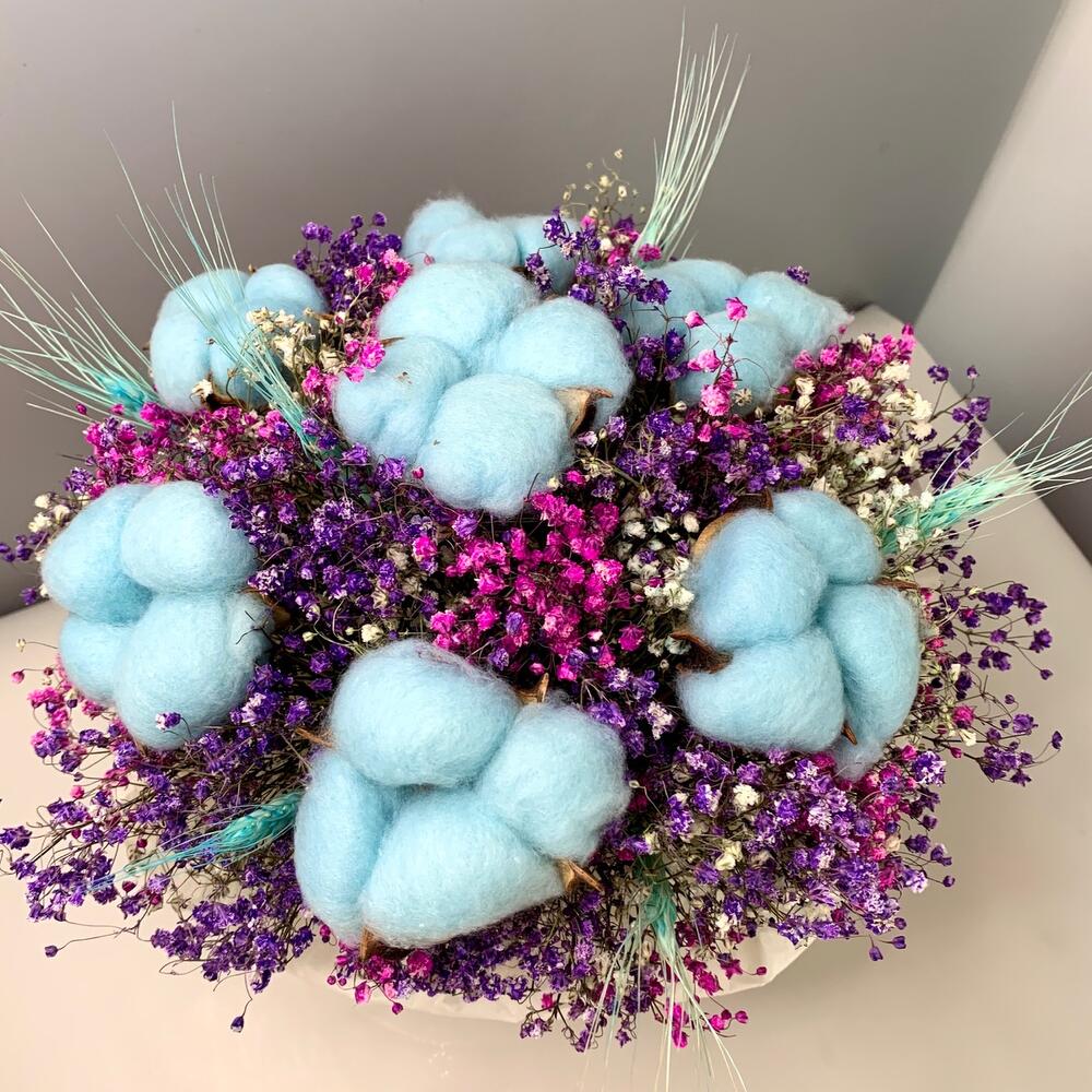 Хлопок – 7 шт.Лента атласная – 2 шт.Тишью – 2 шт.Коробка – 1 шт.Пленка прозрачная – 1 шт.Оазис флористический – 1 шт.Тритикум(пшеница) – 6 шт.гипсофила сухоцвет – 10 шт.