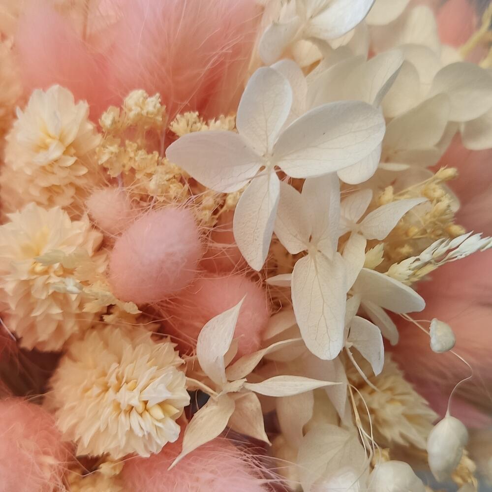 Лента атласная – 1 шт.Колоски – 40 шт.Лента органза – 1 шт.Фаларис – 70 шт.Бриза – 20 шт.Лагурус розовый – 70 шт.гортензия стабилизированная – 1 шт.лагурус нежно розовый – 70 шт.