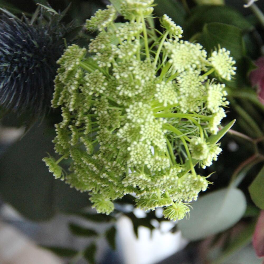 Лилия лонги – 3 шт.флебодиум – 2 шт.эрнигиум – 1 шт.Клематис – 1 шт.Львиный зев – 3 шт.Амми – 3 шт.Хелеборус – 3 шт.Эвкалипт – 2 шт.Лагурус – 9 шт.Лента атласная – 1 шт.