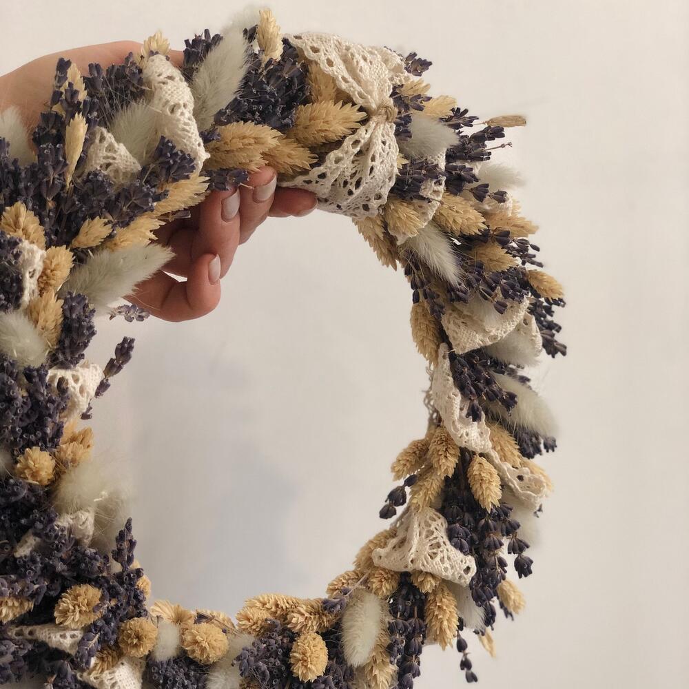 лаванда пучок (сухоцвет) – 4 шт.лагурус пучок – 10 шт.фаларис пучок – 10 шт.Основа для венка – 1 шт.Лента Кружево – 5 шт.