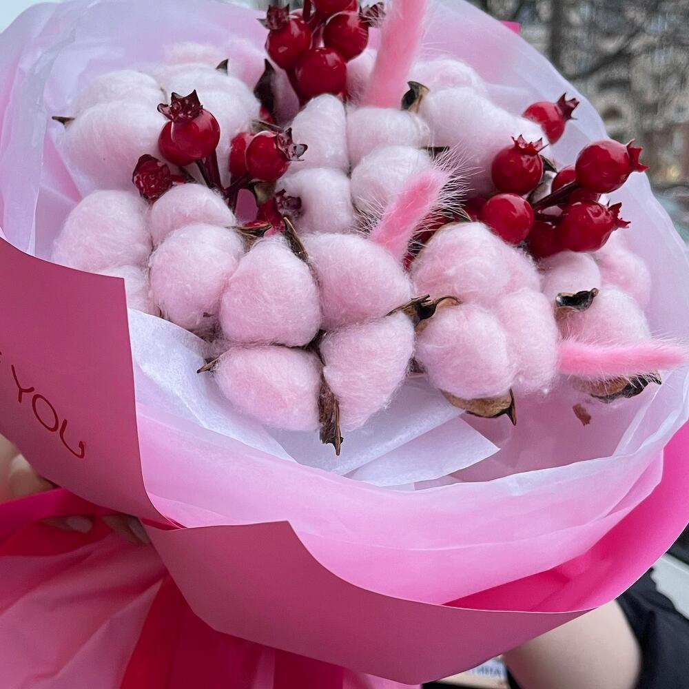 Пленка матовая – 4 шт.Хлопок натуральный – 11 шт.Тишью белое – 4 шт.Лагурус (сухоцвет) – 3 шт.наклейка с пожеланием – 1 шт.ветки декор с глитером – 3 шт.