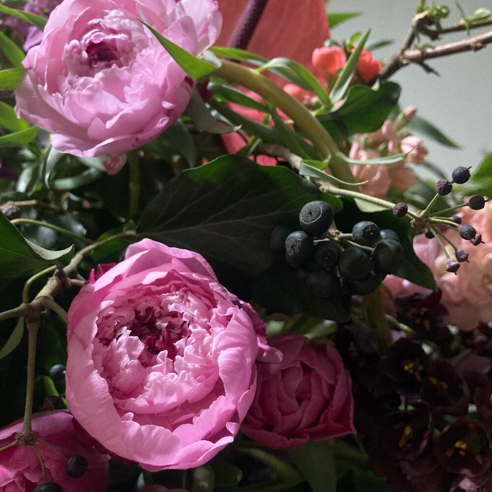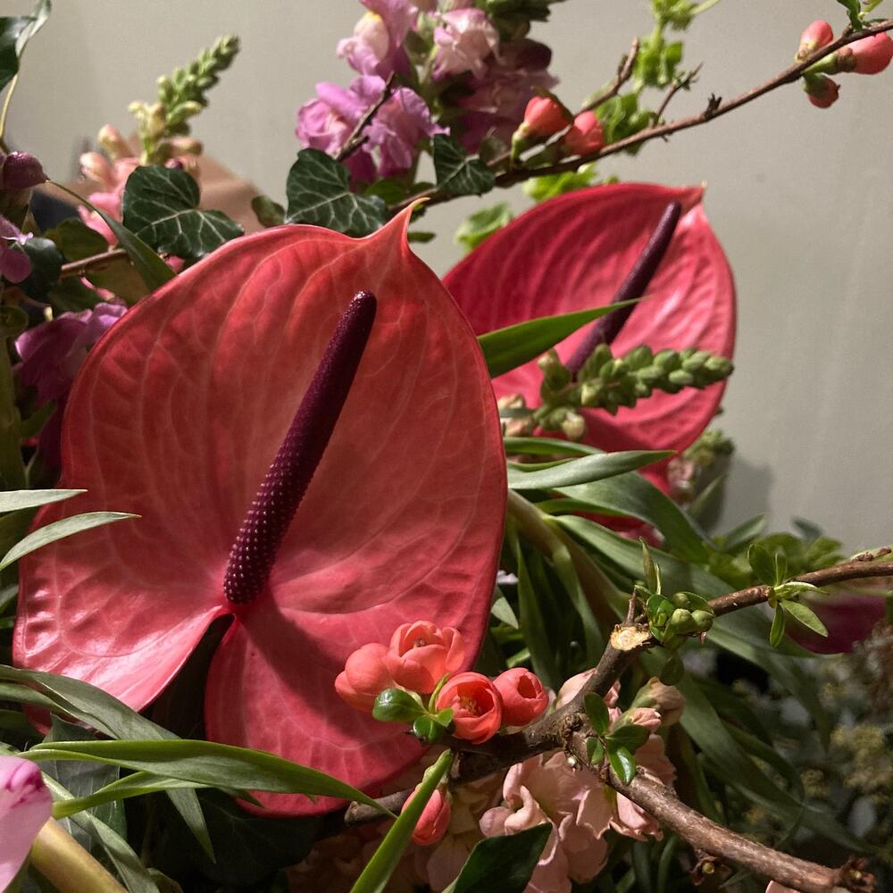 Антуриум – 5 шт.рябчик – 5 шт.Пион – 9 шт.ирландский колокольчик – 3 шт.цветущие ветки – 3 шт.Львиный зев – 9 шт.Маттиола – 9 шт.Хедера – 7 шт.Тюльпан сортовой – 30 шт.Оазис флористический – 4 шт.Корзина – 1 шт.