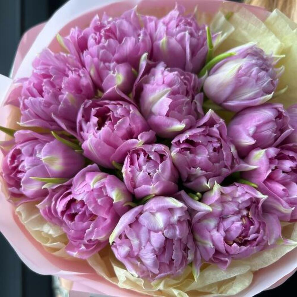тюльпаны – 15 шт.декоративная упаковка – 1 шт.Атласная лента – 1 шт.