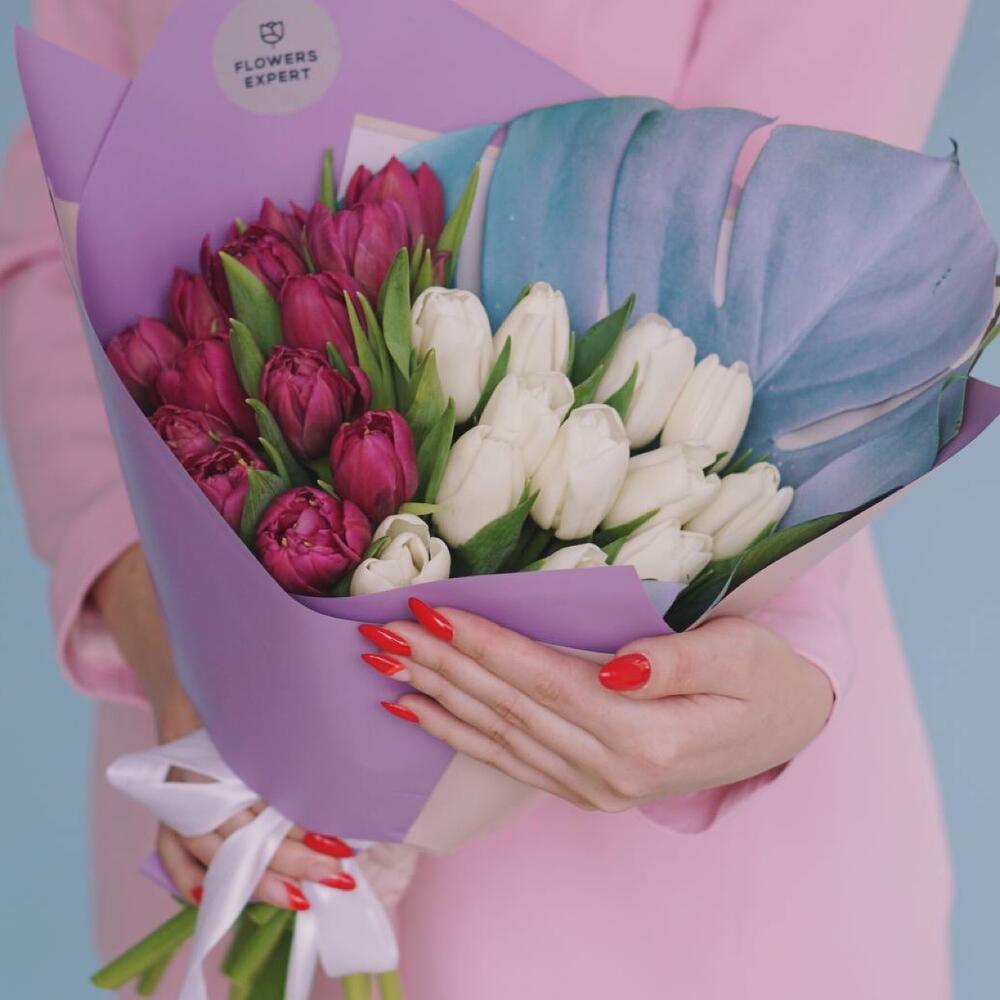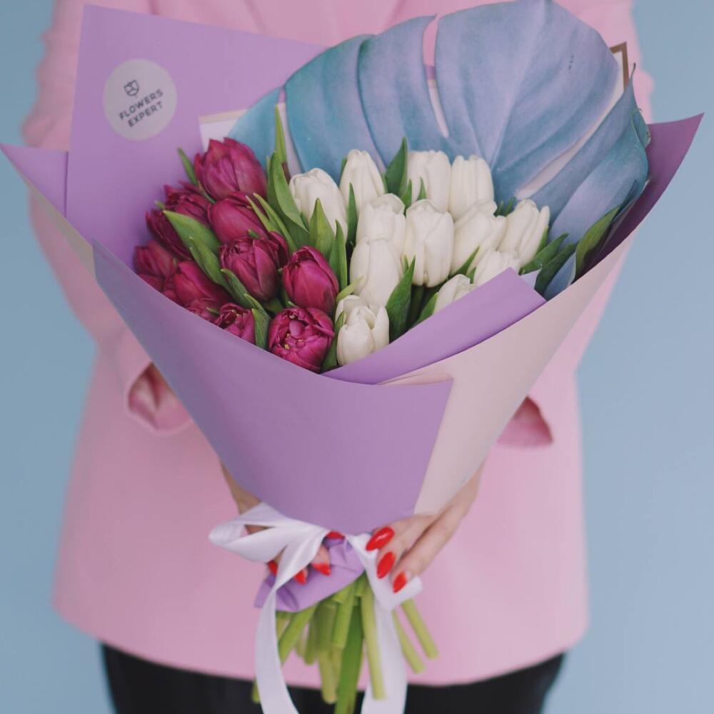 Тюльпан пионовидный – 25 шт.Монстера – 1 шт.Упаковка дизайнерская – 1 шт.