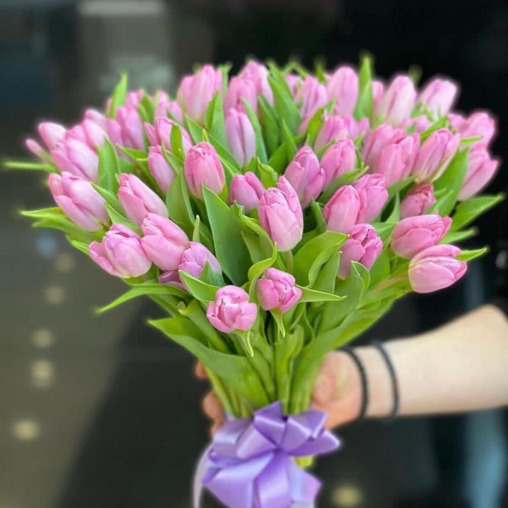 Тюльпан розовый – 51 шт.Лента атласная – 2 шт.Открытка – 1 шт.инструкция по уходу за цветами – 1 шт.хорошее настроение – 100 шт.коробка переноска – 1 шт.Кризал – 1 шт.
