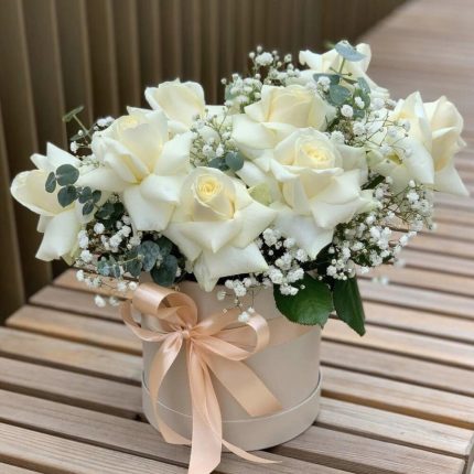 Розы 9 шт в тубусе с гипсофилой и эвкалиптом