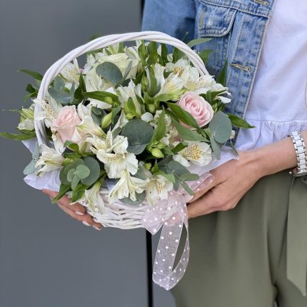 Корзина Ренессанс из эустомы, трахелиума, альстромерии, роз, антирриума и агапантуса