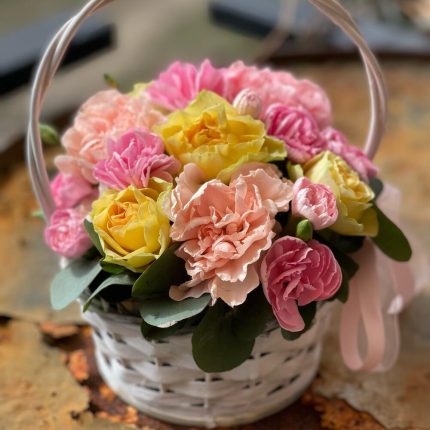 Корзина Прекрасная Иллюзия из роз сорта капучино, фридом, эустомы и кустовых роз
