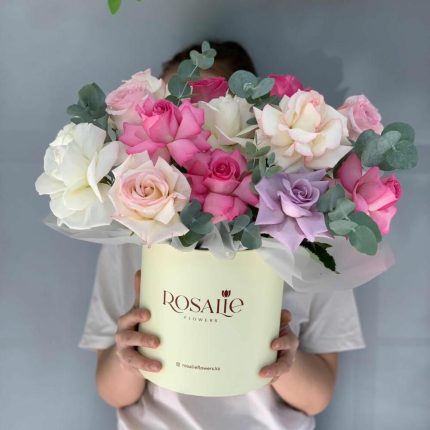 Розы 9 шт в тубусе с гипсофилой и эвкалиптом